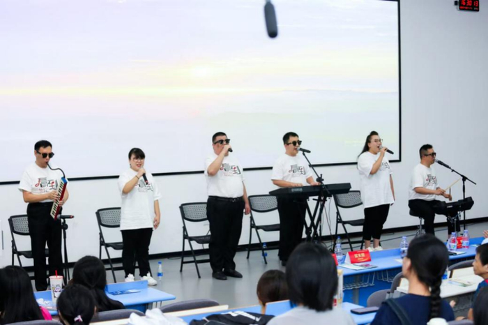 “一个故事一首歌”,讲述着视障人士的生活故事,并根据故事演唱相关主题歌曲。活动还邀请了现场嘉宾和大学生进行盲人世界互动体验,包括听觉体验、触摸体验、盲文科普和体验等,让大家更加深入的了解了视障人士,也用聆听、用盲文共同写出“金融消保,全民反诈”的活动口号。