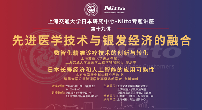 金秋十月,由Nitto(日东)冠名的上海交通大学日本研究中心Nitto专题讲座第十九讲:“先进医学技术与银发经济的融合”主题讲座首次走出校园,选址在上海市嘉定区的上海械谷5号楼会议中心隆重举办。